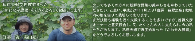 | 栽培予定作物 春・夏 ナス、キュウリ、トマト、ラディッシュ(二十日大根)、インゲン、オクラ、サニーレタス、水菜、スィートコーン、キャベツ 他 秋・冬 ほうれん草、ちぢみほうれん草、カブ、水菜、小松菜、チンゲン菜、インゲン、キャベツ、ブロッコリー 他 |